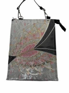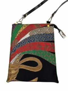 着物シルク100%の帯ショルダーバック。本革紐は7段階調整可能。男女問わず使いやすく、携帯電話や小物も収納可能。使い手と環境に優しいアイテム。
