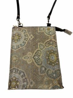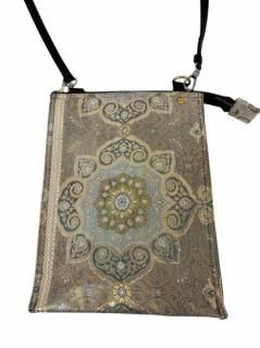 シルク素材の帯ショルダーバック。男女兼用で使いやすく、斜め掛けで携帯も収納可能。本革紐は7段階調整可。着物好きへ贈る一品。