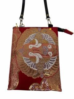 着物シルク100%の帯柄が美しいdual-mode帯ショルダーバック。本革紐は7段階調整可能、長財布や携帯も収納可能。使いやすくシンプル。