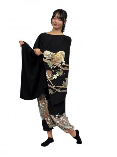 着物ポンチョは、ゆったりしたサイズ感/袖付けがなく、身頃とつながっていて