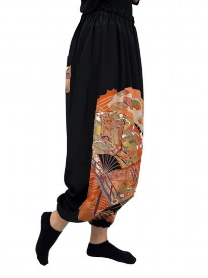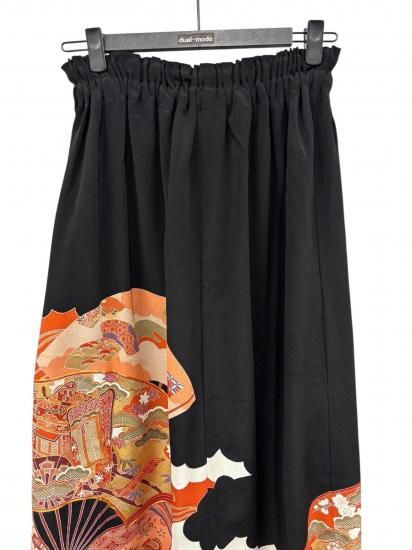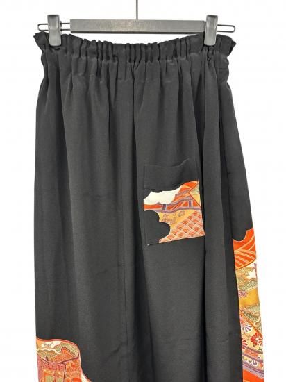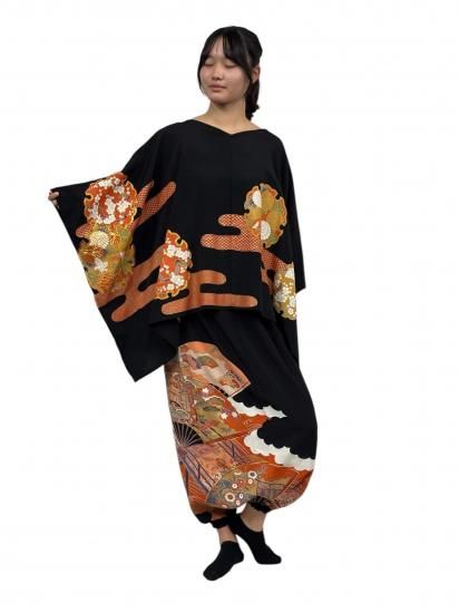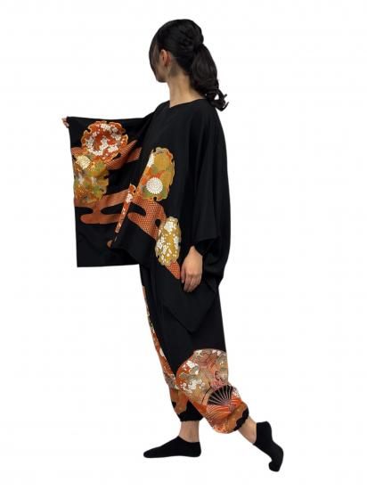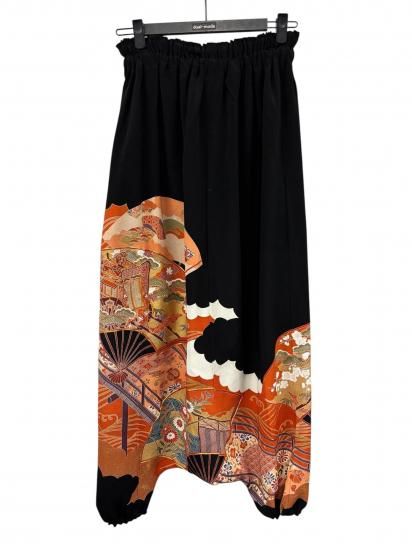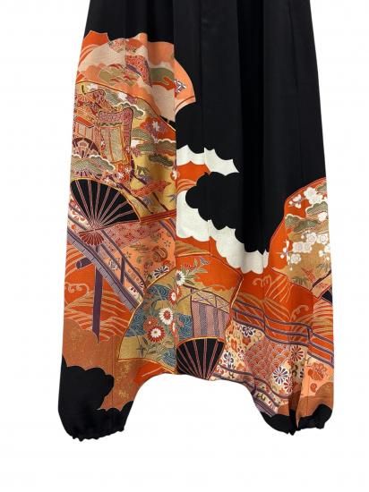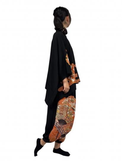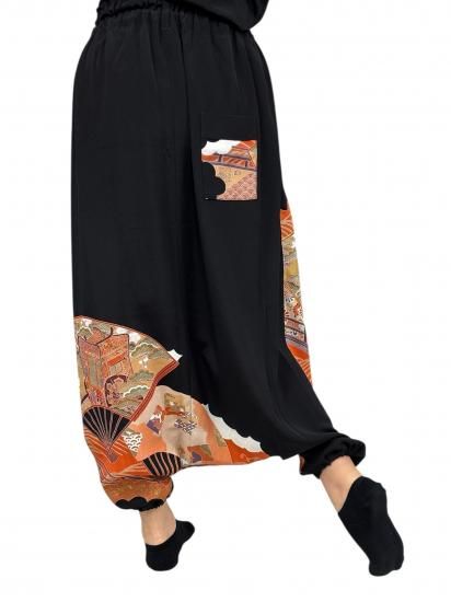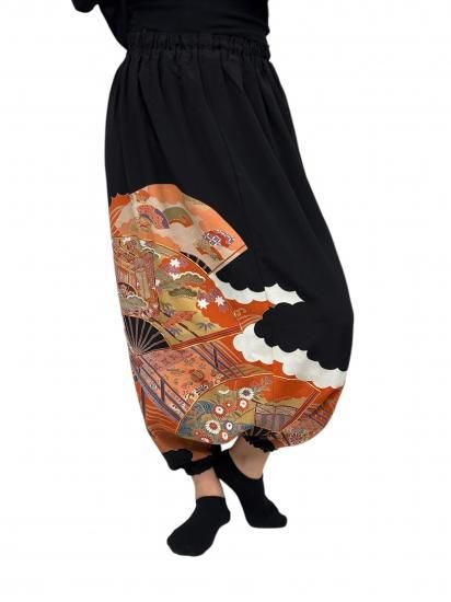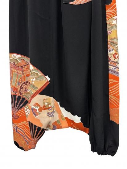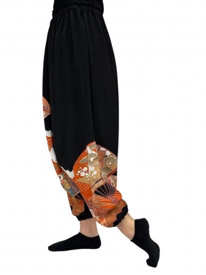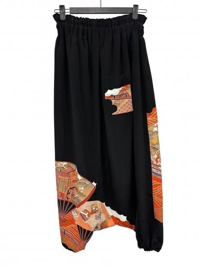 鶴柄のサルエルパンツ。黒留袖から製作。ゆったりサイズ。