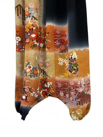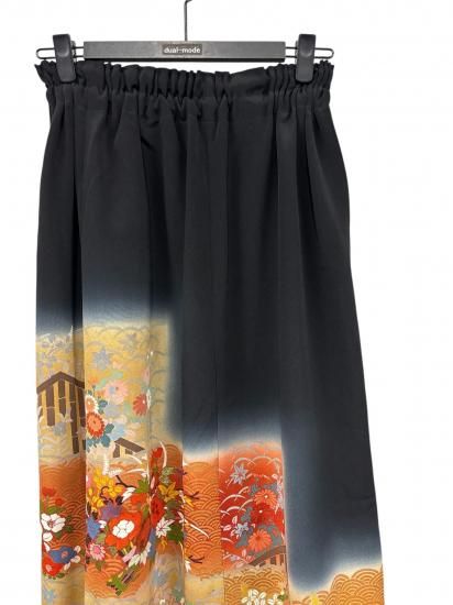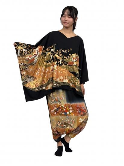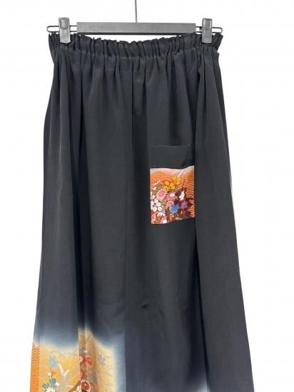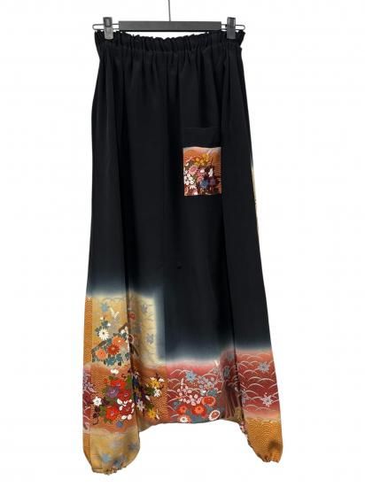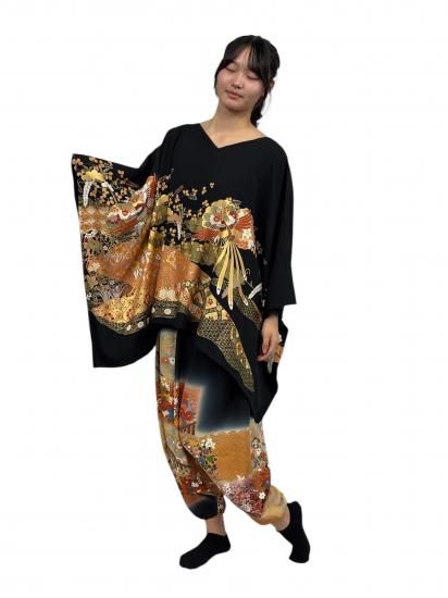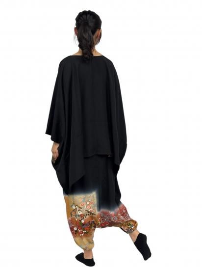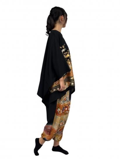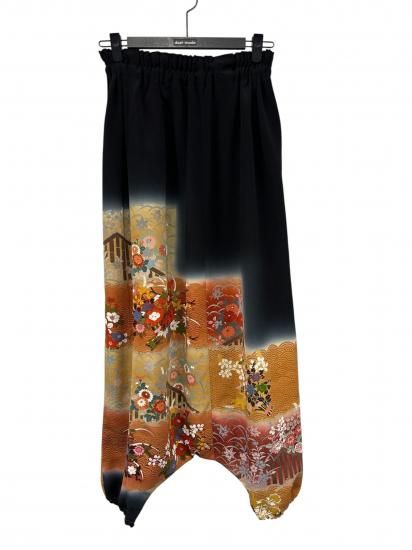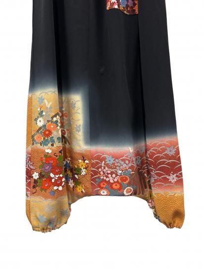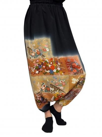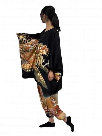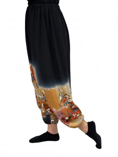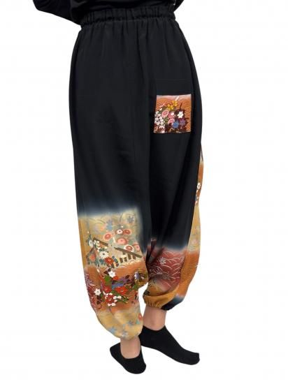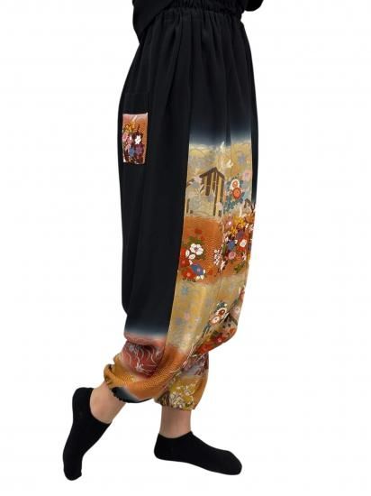 鶴柄のサルエルパンツ。黒留袖から製作。ゆったりサイズ。